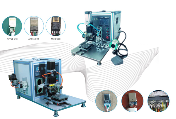 This soldering machine is a single sided wire soldering unit which performs automatic soldering process for USB cable connectors.
